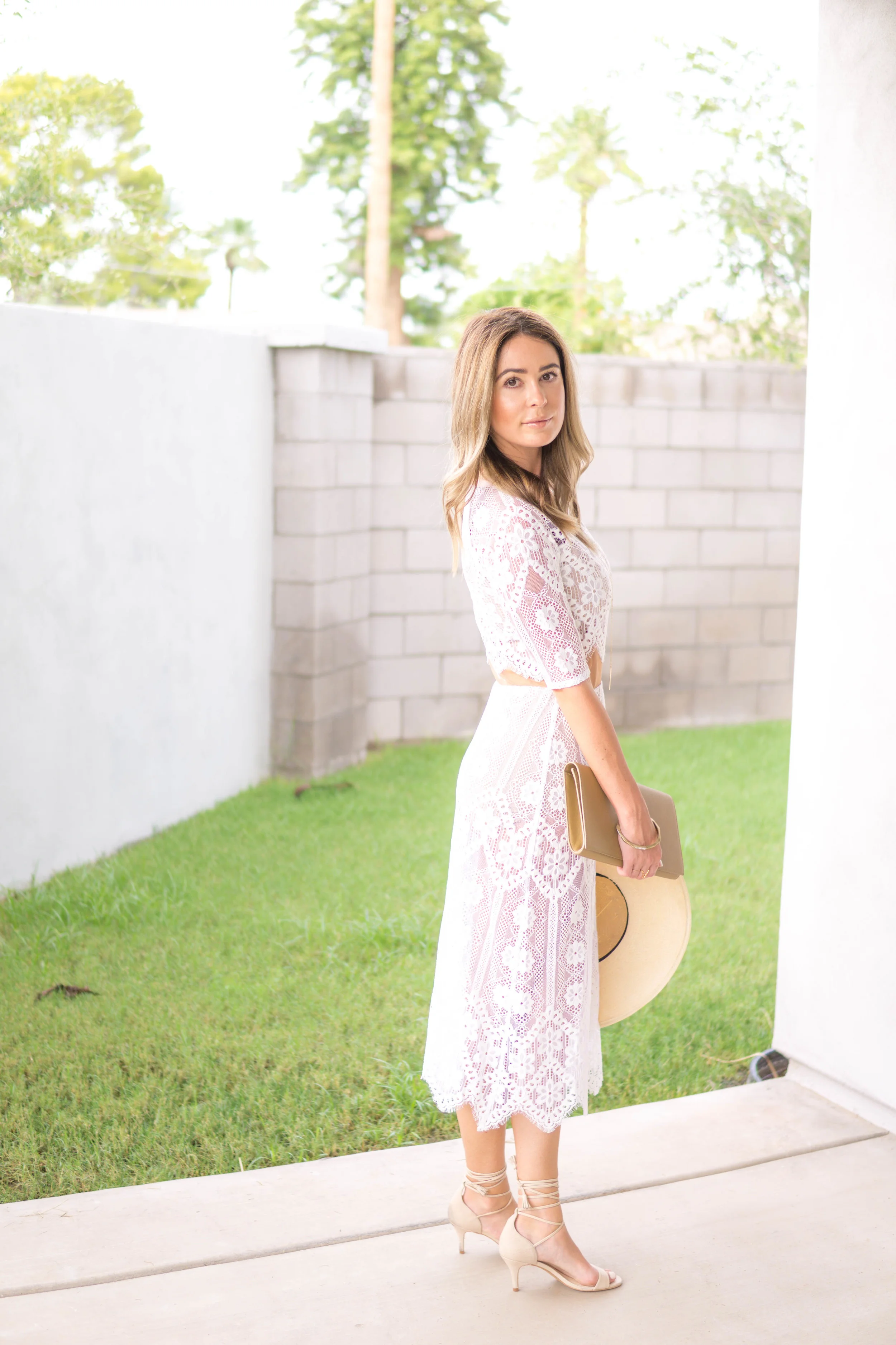 I paired it with a Yves Saint Laurent nude large Belle de Jour Clutch and a Brixton Stillwater Straw Hat. And I basically wear these Vince Camuto nude lacy heels everywhere! They were such a steal.